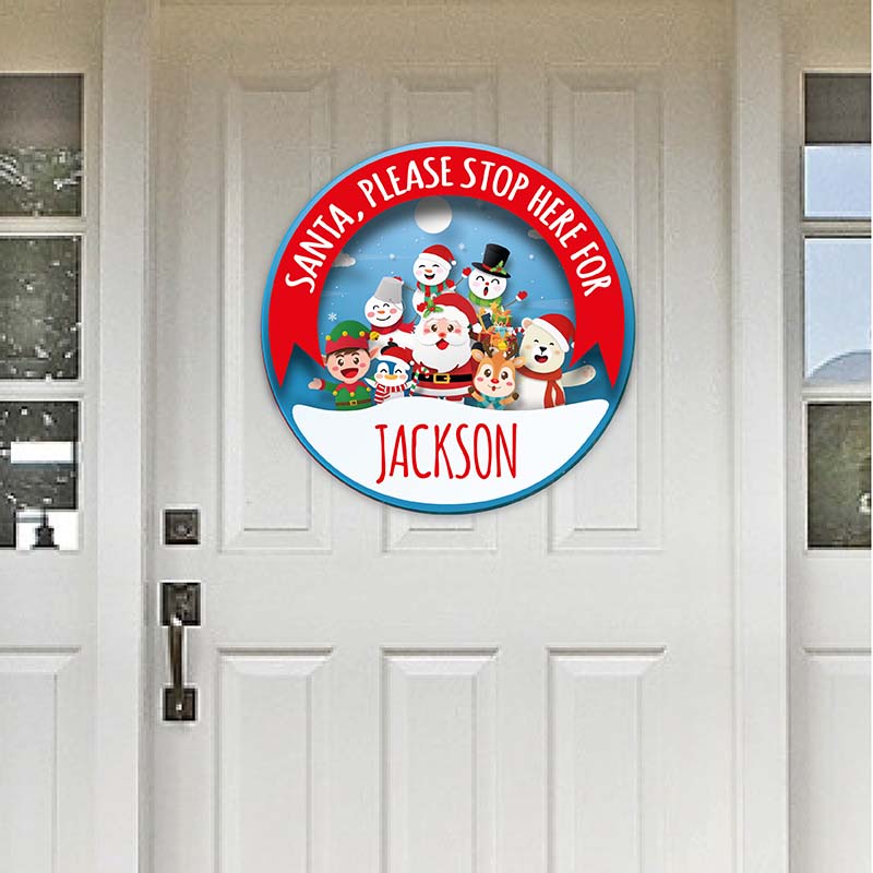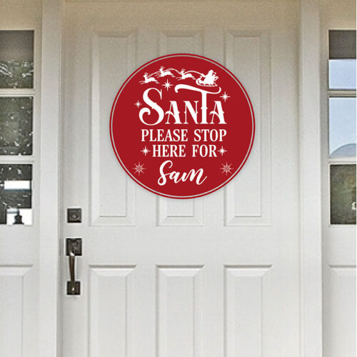 Santa Stop Here Blue door sign is made using a rigid light weight pvc board. the dimensions are 16×16 inches. These signs can be easily attached to the door with double sided sticky tabs. Or a hole could be made at the top so they can hang if requested.